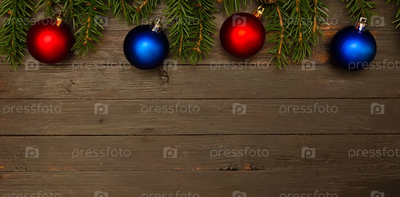 Два красных новогодних шара, два синих шара и еловые ветки