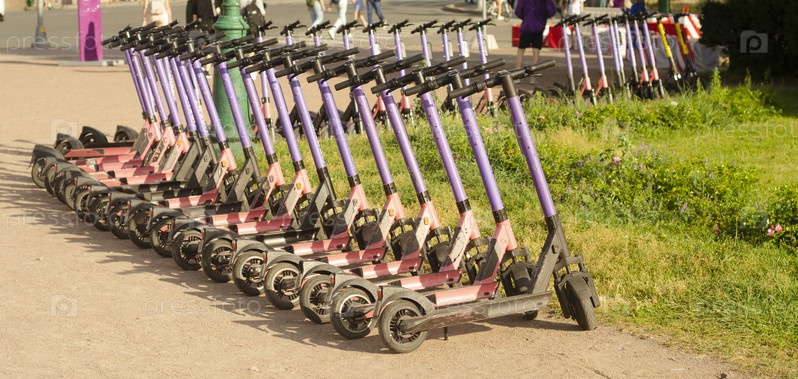 На стоянке в парке много электросамокатов. Прокат электросамокатов