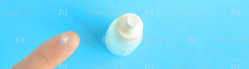 Один контактный линза на пальце и маленькая бутылка глазных капель на синем фоне, кописпейс