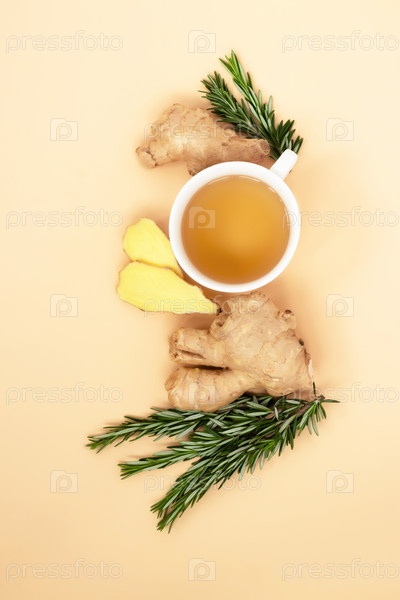 Антивирусный и антистрессовый чай с имбирем и розмарином на светлом фоне
