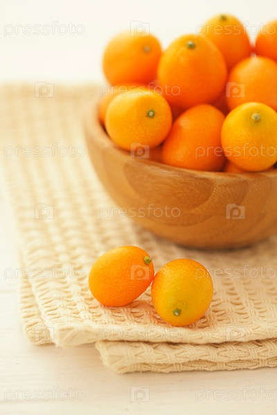 Свежие сочные натуральные кумкваты в деревянной миске