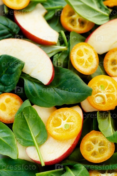 Фон еды: шпинат, салат из яблок и кумквата крупным планом