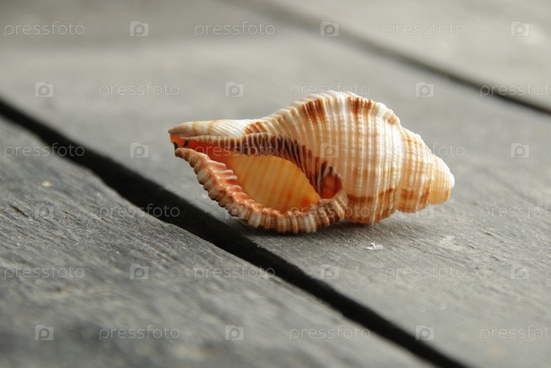 Морская ракушка лежит на винтажном столе. Идея путешествия по морю
