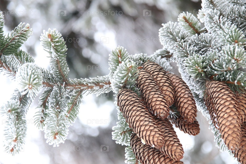 Зимний или рождественский фон, еловая ветвь с сосновой шишкой, покрытая инеем