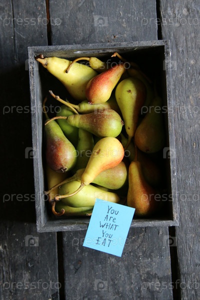 Вы то, что есть теги и сырые органические груши в деревянной коробке на столе на старом винтажном столе