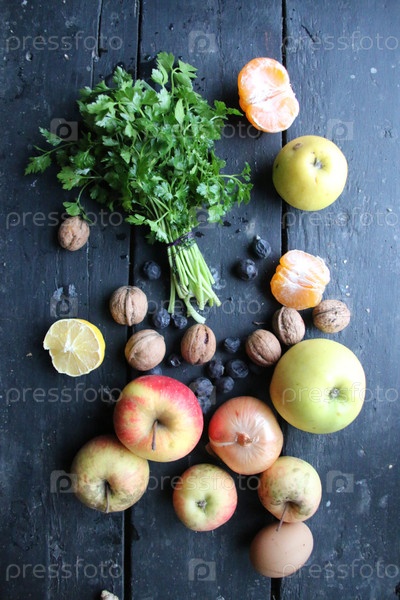 Петрушка и фрукты на старом винтажном столе. Идея здорового питания