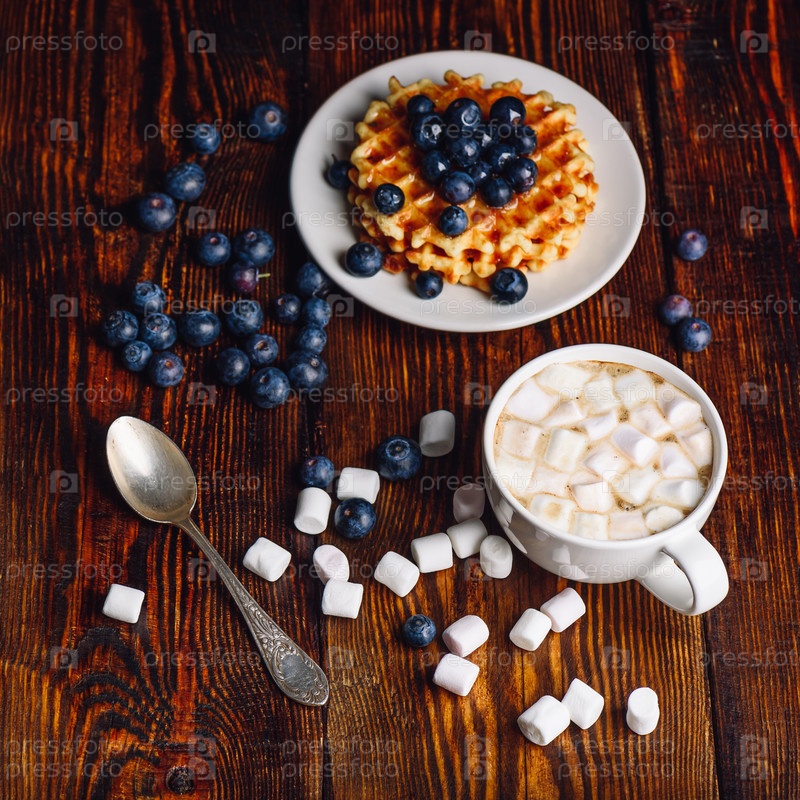 Вафли с черникой и чашкой кофе