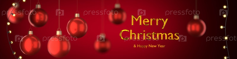 С Рождеством и Новым годом на красном фоне с елковыми игрушками. 3D-рендеринг