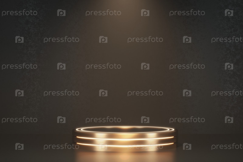 Цилиндрический столб, золотая труба, музейная сцена, пьедестал изделий или подиум. 3D визуализация