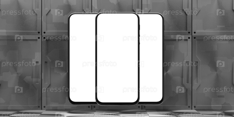 Макет трех смартфонов на сером фоне. Белый экран телефона для вашего дизайна. 3д рендер