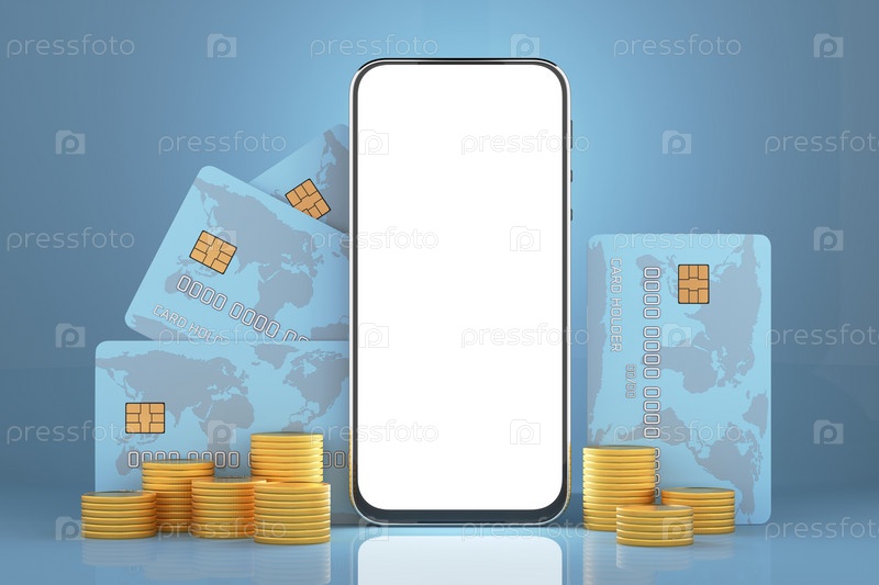 Концепция мобильных платежей Белый пустой экран смартфона Пластиковая карта для онлайн-платежей 3D визуализация