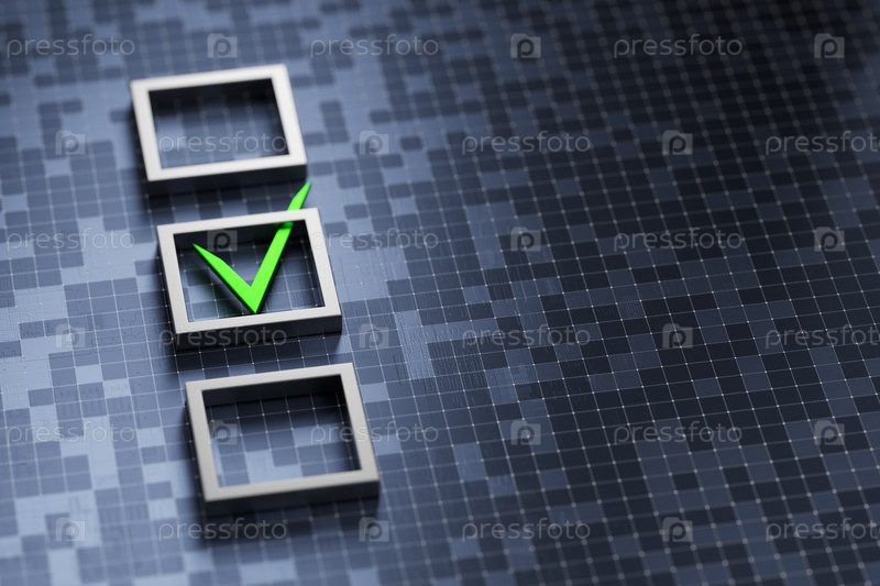 Зеленый знак в рамке выбора. Мы делаем правильный выбор. Опрос общественного мнения. Демократические институты голосуют за демократические выборы, референдум. Подтверждение, тестовый тест. Экспертиза. Реализация закона. 3D визуализация