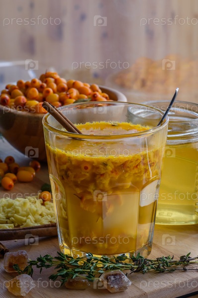 Смесь имбиря и облепихи в стакане с корицей