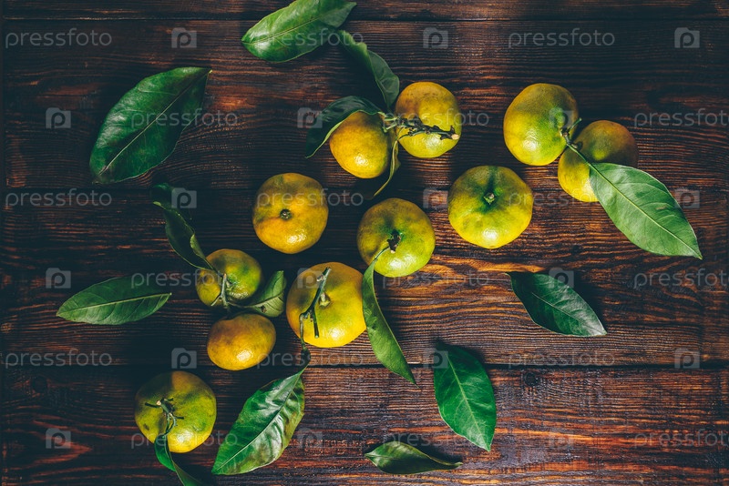 Желто-зеленые мандарины с листьями на деревянной поверхности