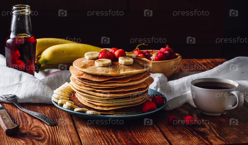 Домашние блины с фруктами, кленовым сиропом и чашкой чая