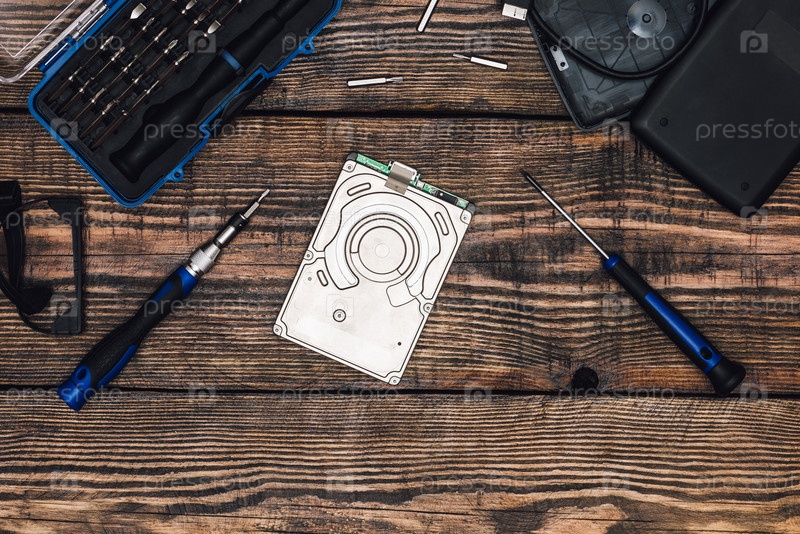 Жесткий диск с прецизионной отверткой на деревянном столе