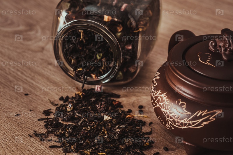 Азиатский чайник на подставке и банка с россыпью чая