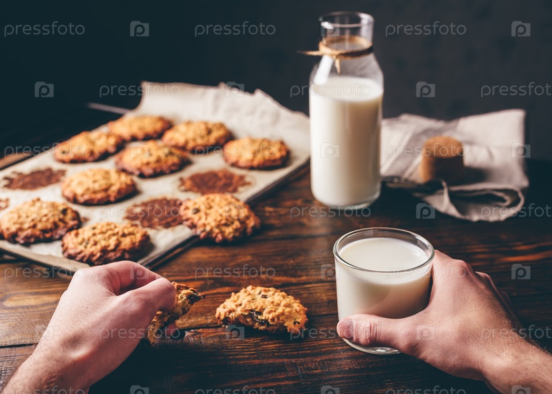 Домашнее овсяное печенье. Мужские руки держат печенье и стакан молока. Некоторые печенья на пергаментной бумаге с бутылкой на фоне