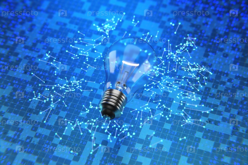 Концепция запуска, стартовые инвестиции. Концепция идеи, лампочка с идеей надписи на цифровом фоне. 3д рендер