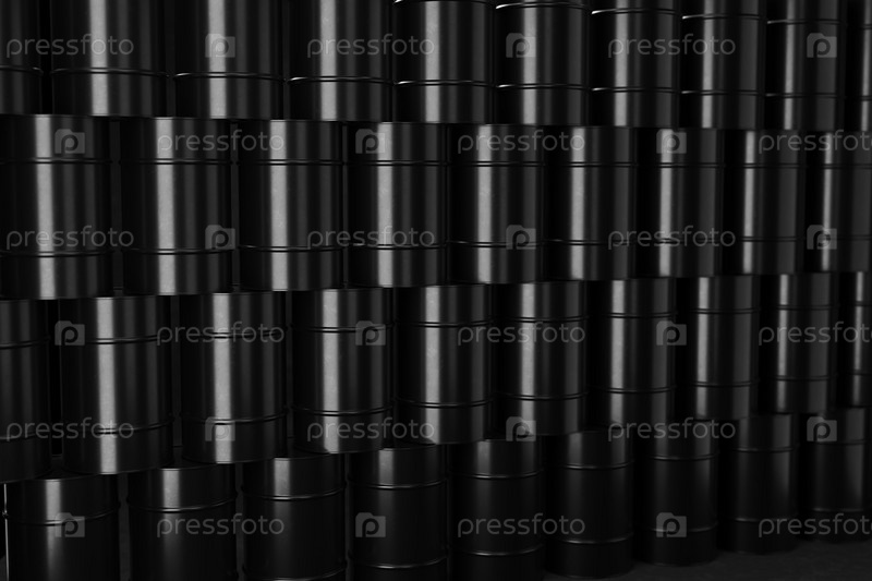 Металлические бочки черного цвета в куче. 3D визуализация