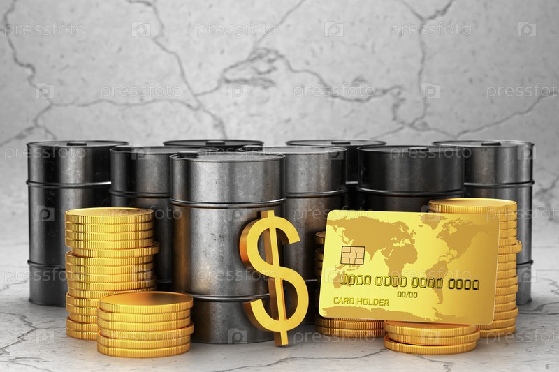 Концепция торговли нефтью и топливом. Бочки из черного металла с монетами и долларовым винтом. 3D-визуализация