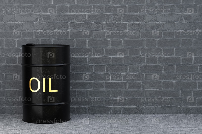 Черная металлическая бочка с надписью маслом возле кирпичной стены. 3D визуализация