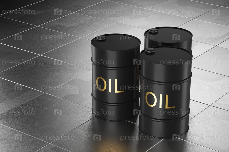 Бочки с нефтью на технологическом фоне. несколько черных металлических бочек. 3D визуализация