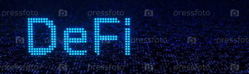 Надпись DeFI на абстрактном фоне, концепция нескольких сетевых подключений. Децентрализованные финансы DeFi на цифровом фоне. 3D-рендеринг