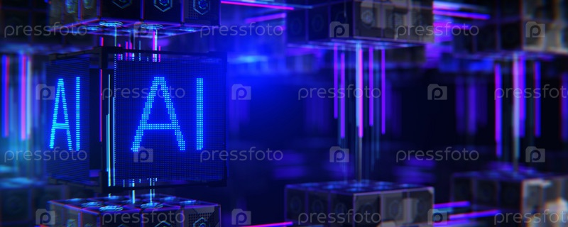 Концепция алгоритма искусственного интеллекта в футуристическом процессоре. Концепция ИИ. Глубокое обучение. Развитие ИИ. 3D-рендеринг