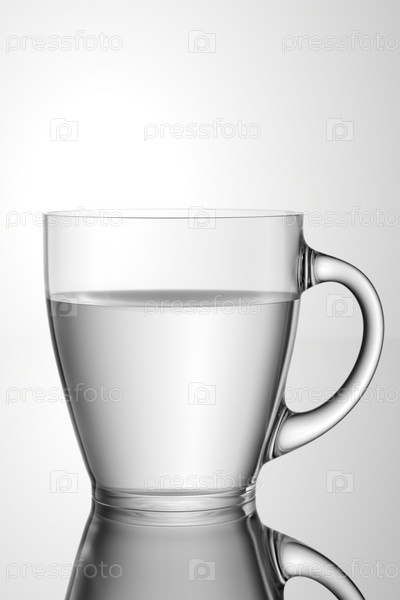Стеклянная кружка с ручкой, заполненная водой на белом фоне. 3D-рендеринг