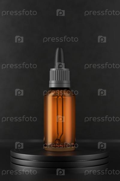 Бутылка из янтарного стекла с пипеткой внутри на темном фоне. Товарный подиум. 3д рендер
