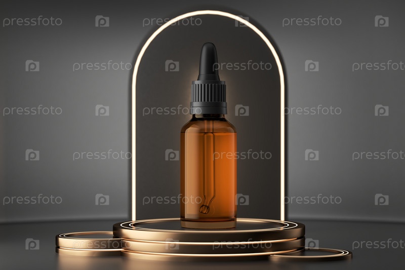 Флакон из янтарного стекла с пипетками внутри на золотом постаменте. 3D-рендеринг