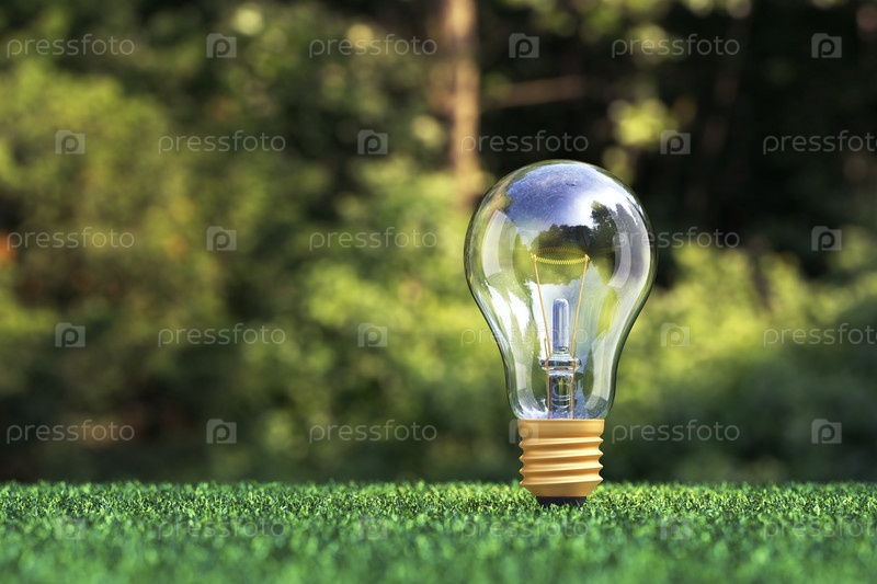 Концепция экологически чистого источника энергии. Лампочка на траве. 3д рендер