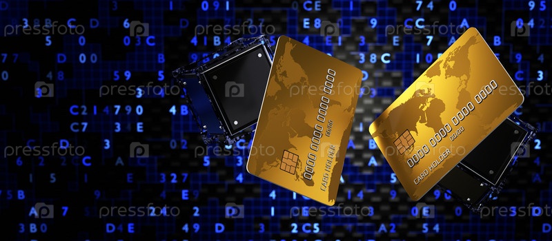 Золотые кредитные карты на цифровом фоне. Понятие электронных платежей. 3д рендер