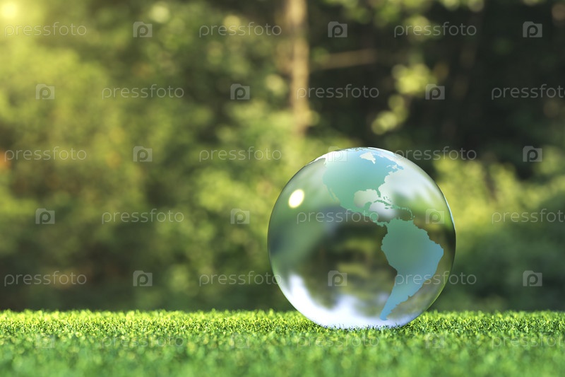 Охрана окружающей среды, экология и кристаллический шар мира. крупный план хрустального глобуса земного шара на зеленом травянистом поле. 3D-рендеринг