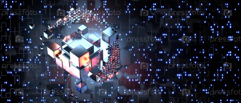 Концепция обучения искусственному интеллекту.Блоки Hi-tech Square собраны в кубический массив на фоне информационных полей.3D-рендеринг