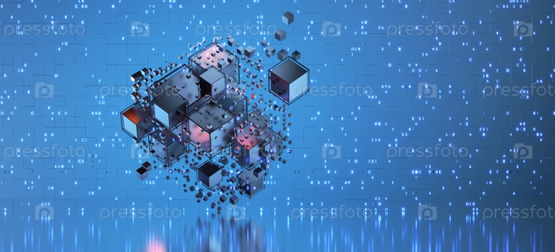 Концепция технологии блокчейн. Блоки Hi-tech Square собраны в кубический массив на фоне информационных полей. Концепция обучения искусственному интеллекту. 3D-рендеринг