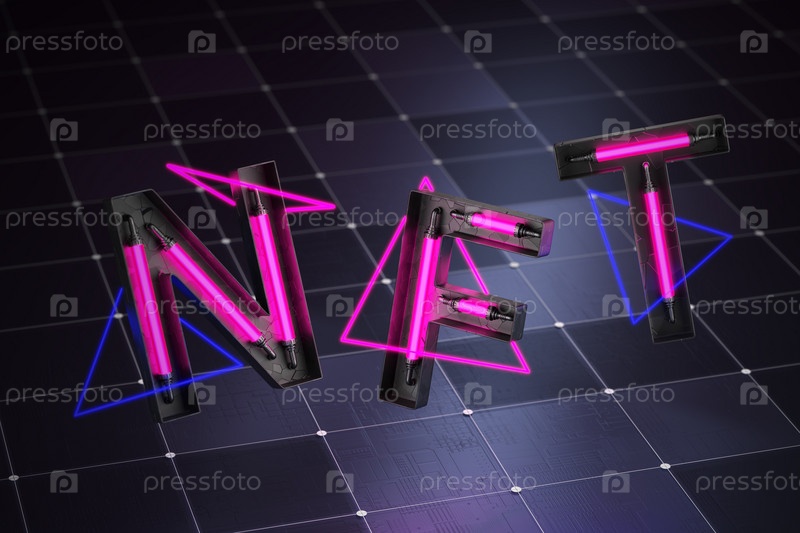 Токен NFT. Текст NFT на тёмном футуристическом фоне. Концепция не взаимозаменяемых токенов NFT. 3D-рендеринг