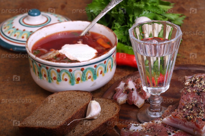 Борщ с овощами, салом и водкой