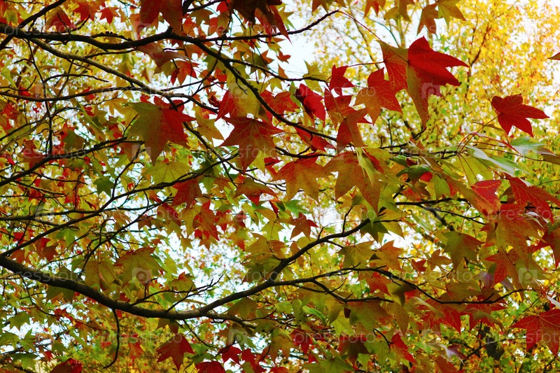 Осень. Желтые и красные осенние листья клена, платана, ликвидамбара