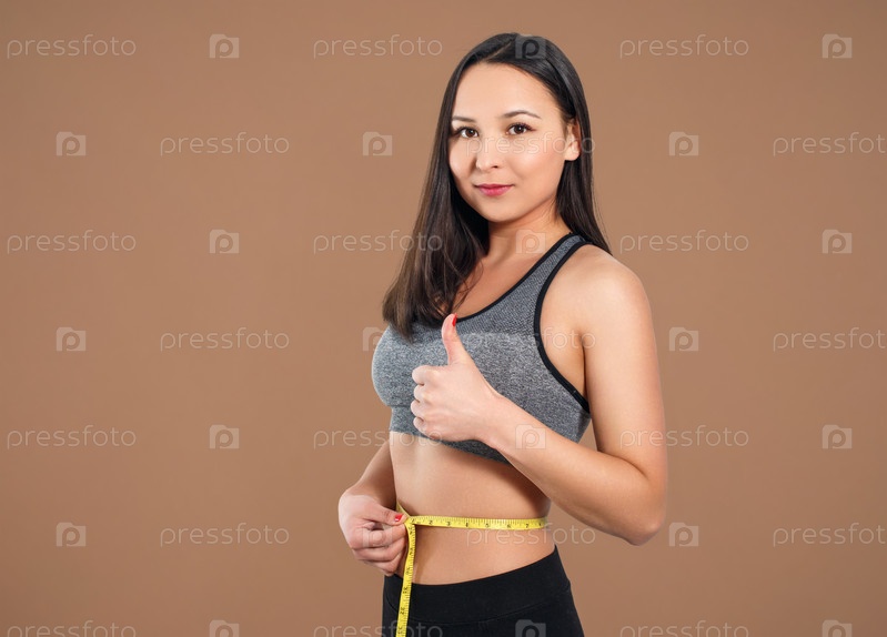 Стройная женщина измеряет свою талию сантиметровой лентой. на коричневом фоне