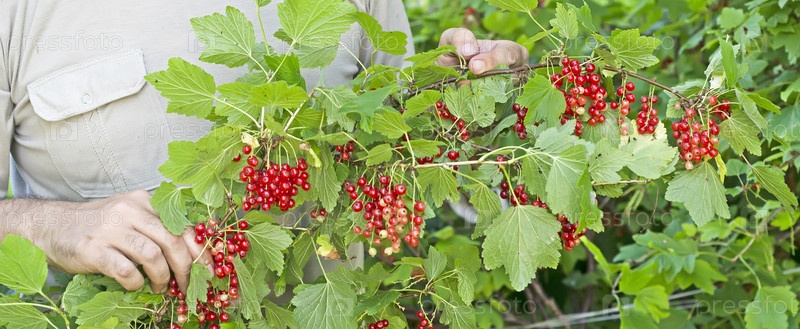 Садовник держит в саду грозди красной смородины. Сезон сбора урожая