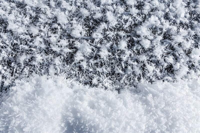 Изморозь и сугроб на льду зимой. Большие снежинки на озере. Снежный фон