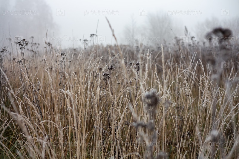 Сухая полевая трава в осеннем утреннем тумане