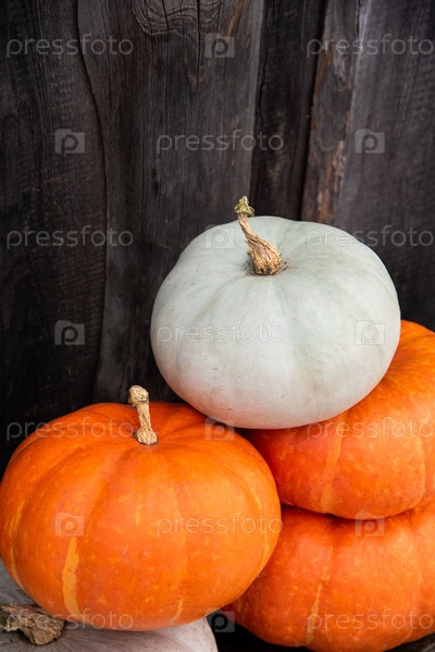 Яркие спелые оранжевые и белые тыквы на сером деревянном фоне