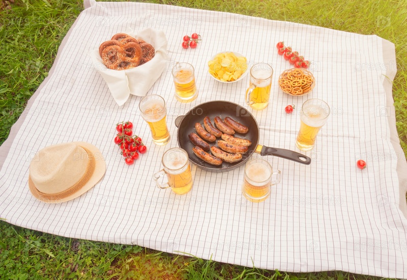 Пикник с пивными кружками и стаканами, жареными сосисками и закусками к пиву