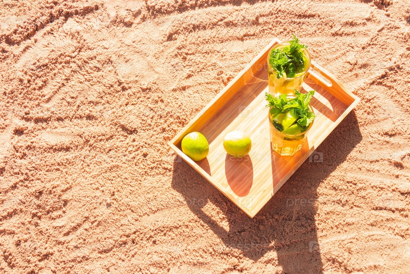 Два стакана коктейля мохито на песчаном пляже. Выборочный фокус. Вид сверху, пространство для копирования