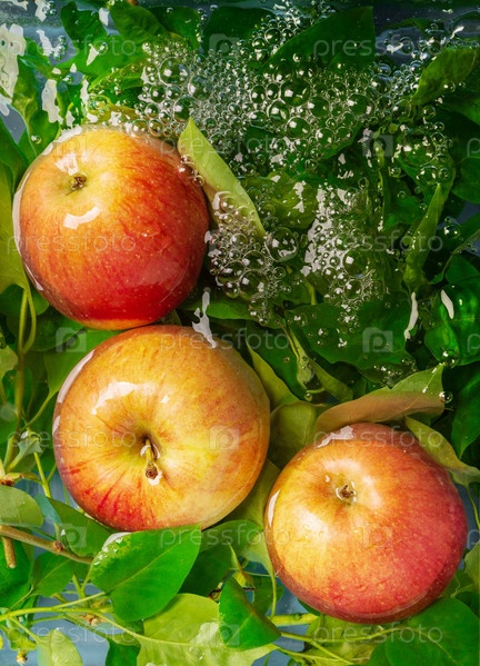 Три красных яблока на зеленых листьях в потоке воды