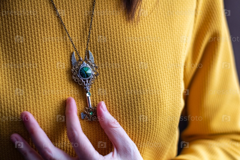 Аксессуар со сказочной подвеской-ключом на желтом платье