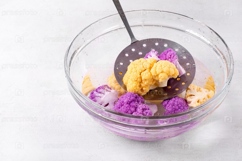 Бланшированная цветная капуста фиолетового и желтого цветов остывает в холодной воде в стеклянной миске на белом столе. Подготовка ингредиента
